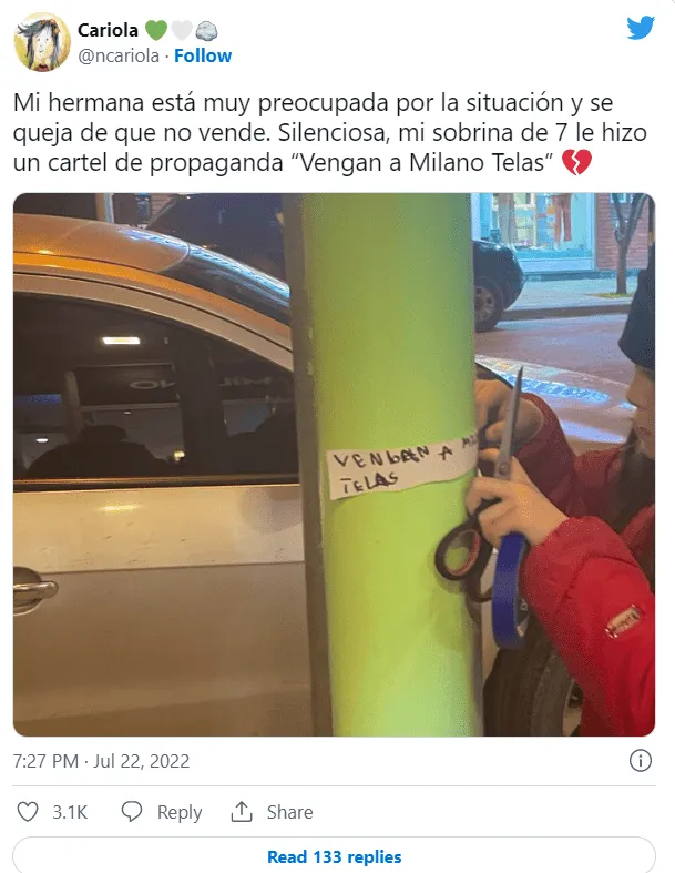 "Mi hermana está muy preocupada por la situación y se queja de que no vende. Silenciosa, mi sobrina de 7 le hizo un cartel de propaganda "Vengan a Milano Telas" , escribió la mujer en la publicación que acompaña la foto de la pequeña.