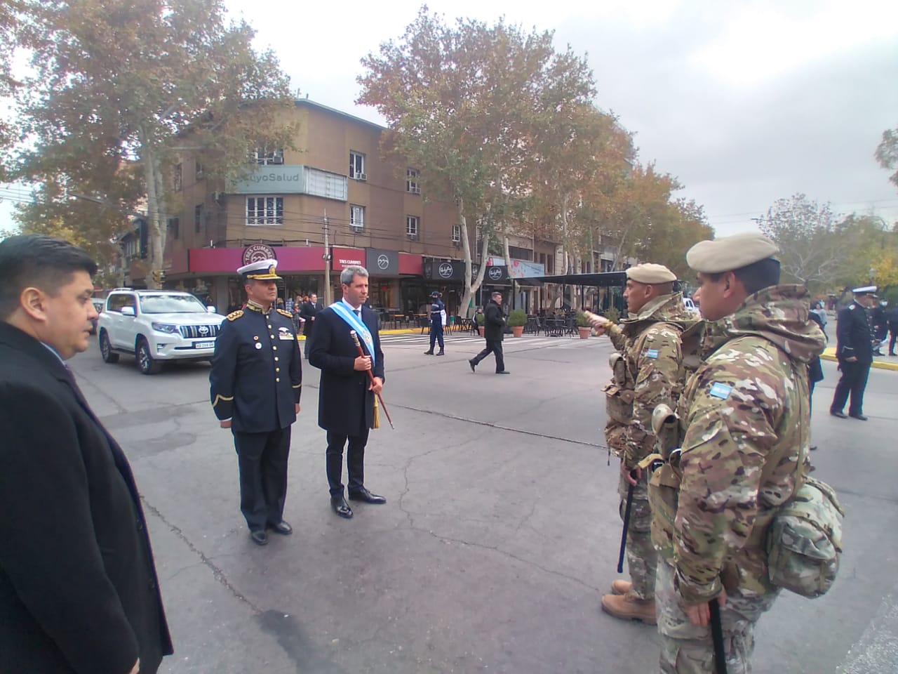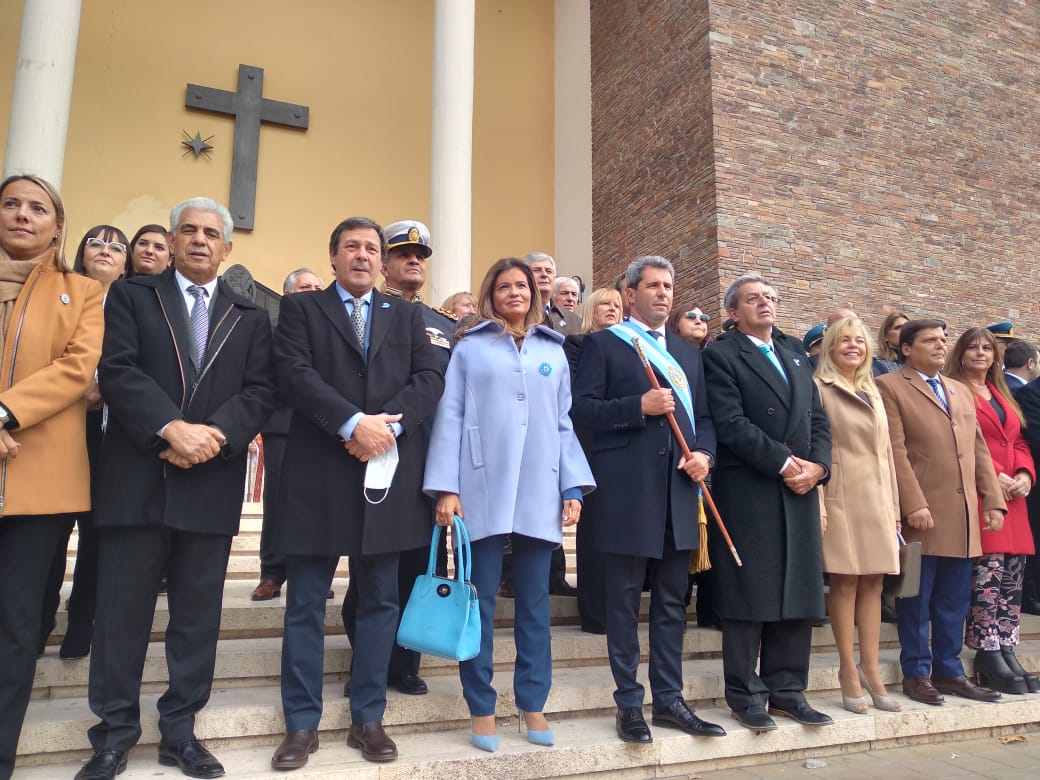 Tal como indica la tradición de los actos por el 25 de Mayo, el gobernador Sergio Uñac saludó a las tropas y fuerzas de seguridad de la provincia antes del ingreso a la Catedral para ser parte del Tedeum.