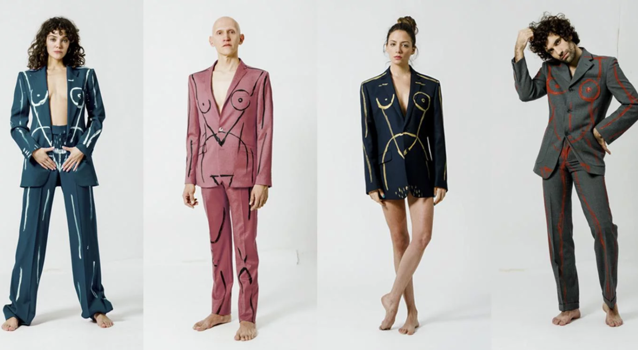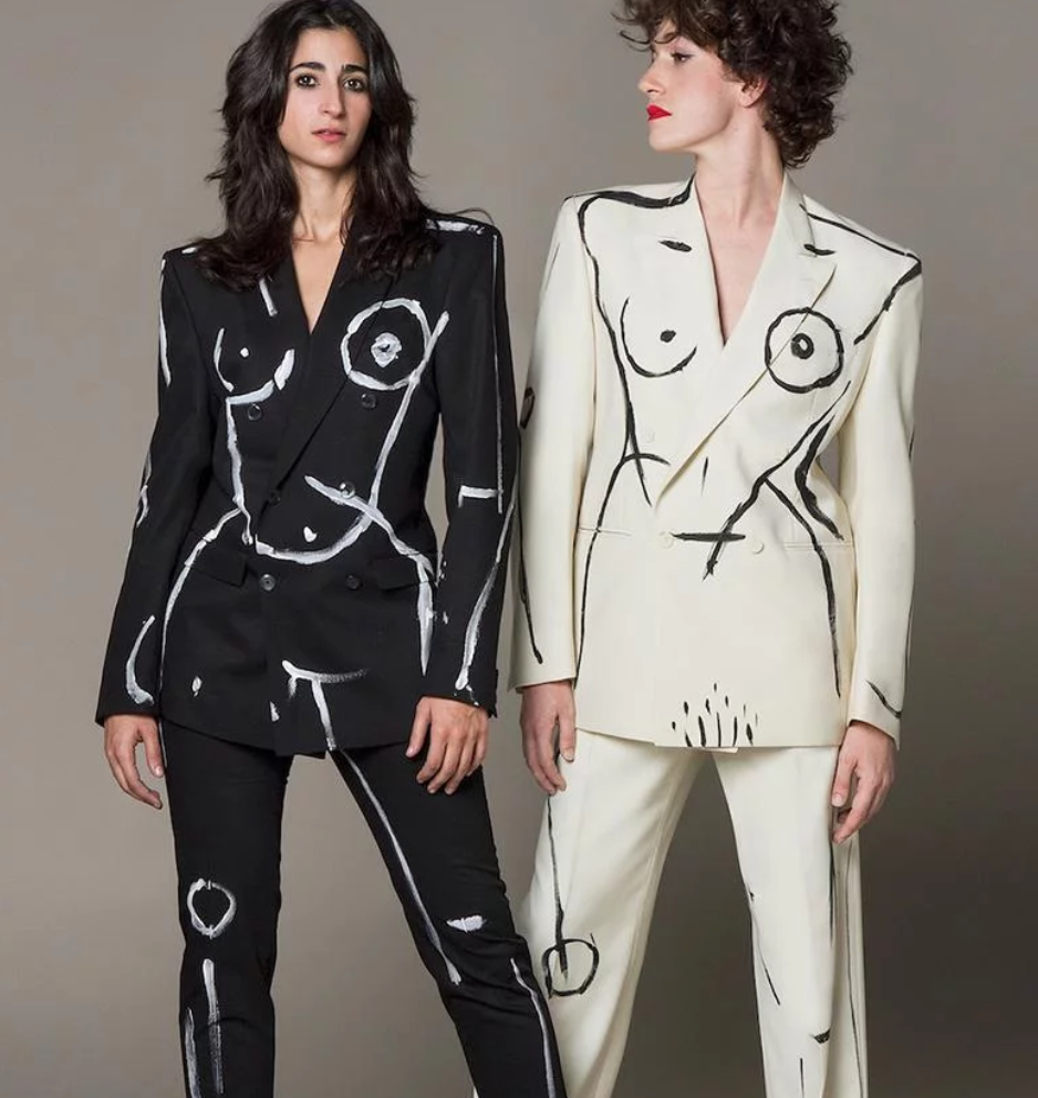 Son dos piezas, pantalón y chaqueta, de corte masculino, intervenidos con “brochazos” de atributos femeninos pintados a mano. “Un día me hice un traje y me fui con él puesto a andar por Madrid. Fue muy fuerte porque empaticé totalmente con la situación que viven las mujeres cada día. Nunca me han mirado tanto con esa falta de delicadeza, es agresivo de verdad”, contó Artillo al diario El País.