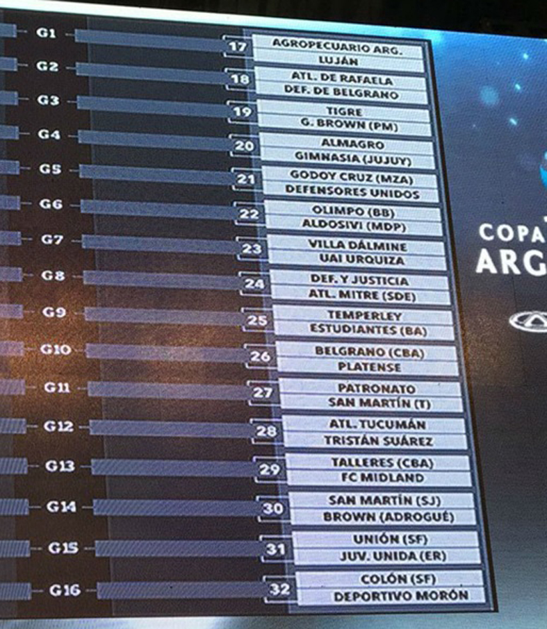 El sorteo de la séptima edición del torneo más federal de la Argentina determinó éstos partidos: Estudiantes LP-Central Cba. de Rosario; Lanús- Douglas Haig; Vélez-Central Cba. (Sgo. del Estero); Arsenal-Cipolletti (Río Negro); Newell”s- Dep. Rincón de los Sauces; Gimnasia La Plata- Sp. Belgrano de San Francisco (Cba.); Chacarita- Maipú de Mendoza; Banfield- Lamadrid; Huracán- Victoriano Arenas; y Rosario Central- Antoniana de Salta.