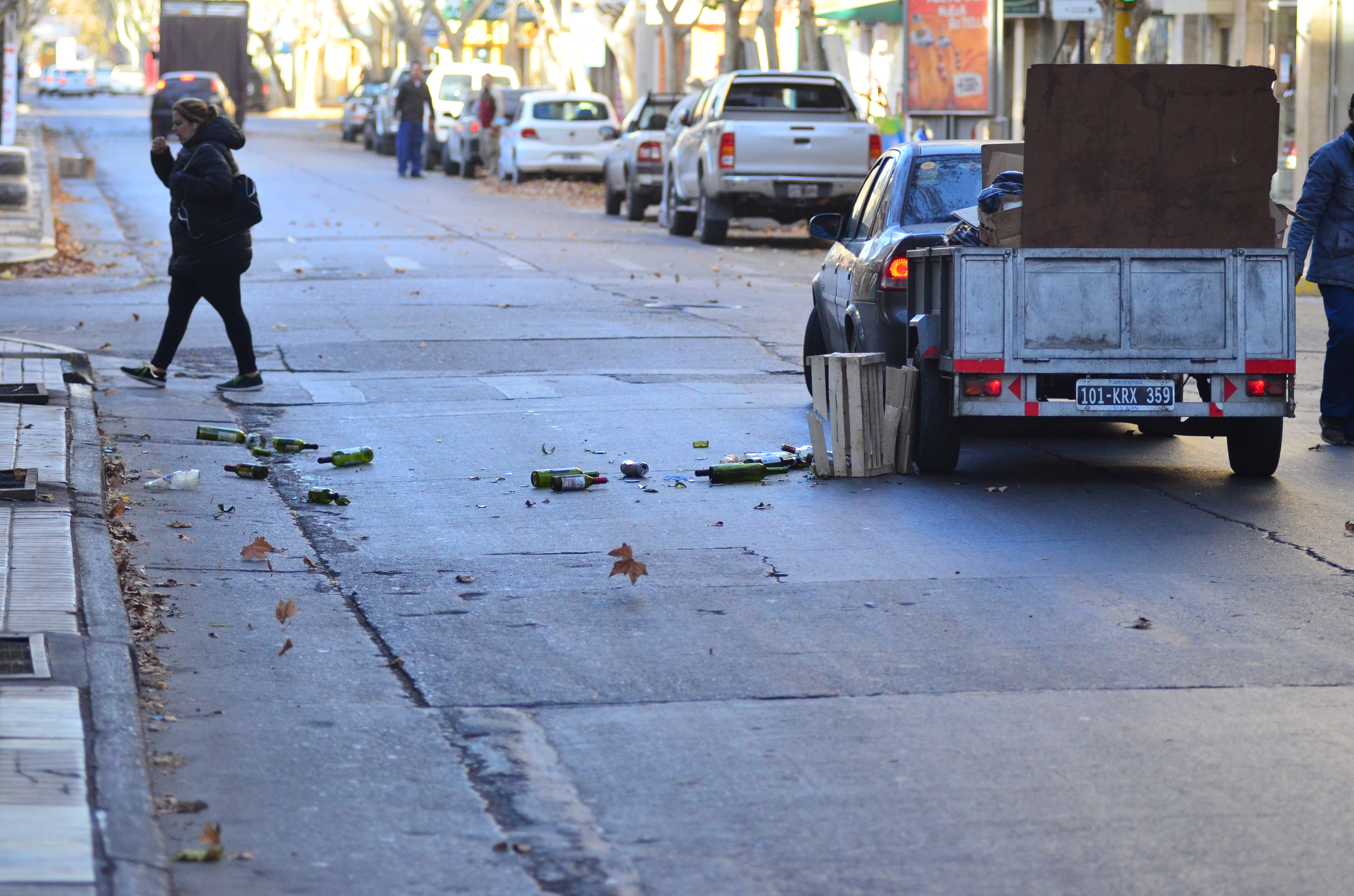 Un hombre que transitaba en pleno centro con una carga de cajones con botellas, fue perjudicado por el viento que volcó un cajón con varias botellas.