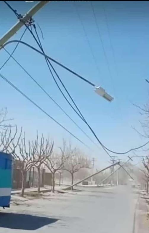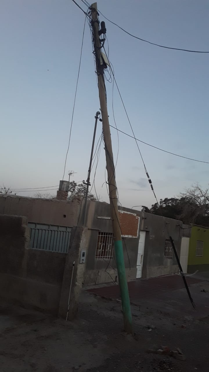 *En el interior de Villa Santa Anita, en Rivadavia, se reportó la caída de un poste de luz sobre una vivienda sin que acarreara mayores daños, pero sí se cortó el servicio eléctrico.