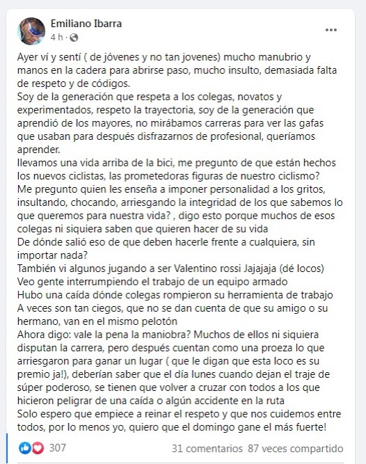 Este lunes, el ciclista Emiliano Ibarra escribió un extenso y llamativo mensaje en las redes sociales sobre algunas costumbres que ha notado que han cambiado en el pelotón. En su texto comenzó diciendo que ayer (por este domingo) vio y sintió que jóvenes y no tanto tuvieron "falta de respeto y de códigos".
