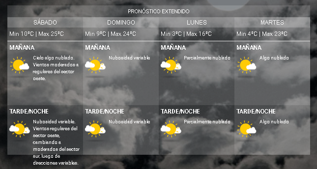 Por su parte, el Servicio Meteorológico Nacional indica que la máxima llegará hasta los 25ºC mientras que la mínima caerá hasta los 11ºC.