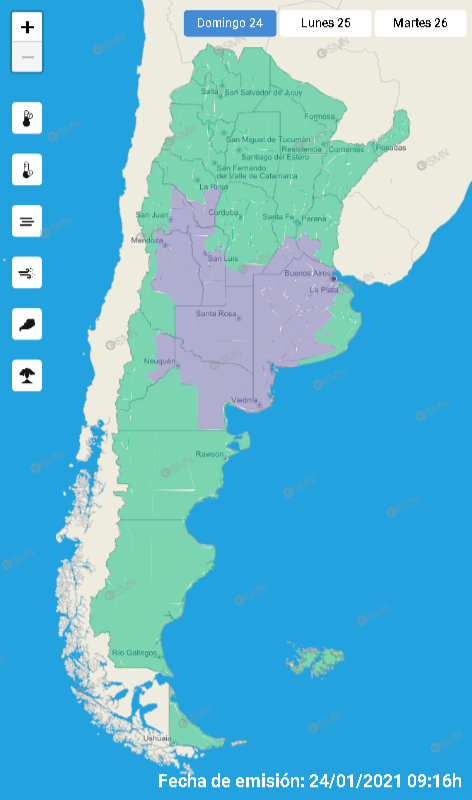 El aviso tiene vigencia desde las seis de la mañana del domingo y se prevé que continúe hasta la tarde del lunes. Comprende a la Ciudad y la Provincia de Buenos Aires, Córdoba, Entre Ríos, La Pampa, La Rioja, Mendoza, Neuquén, Río Negro, San Luis, San Juan y Santa Fe. No constituye una alerta, que toma como referencias a las lluvias, tormentas, nevadas o vientos fuertes, sino que supone una advertencia por fenómenos como altas o bajas temperaturas, niebla, polvo, humo o ceniza volcánica.
