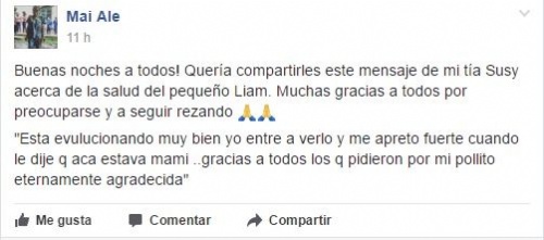 A través de una de las sobrinas, se hizo pública una emocionante reacción que tuvo Liám cuando lo visitó Susana. "Está evolucionando muy bien. Yo entré a verlo y me apretó fuerte cuando le dije que acá estaba mami…".