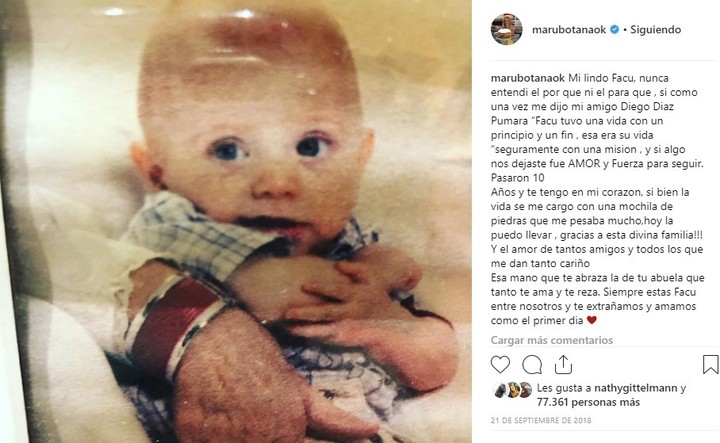 El año pasado Botana también había recordado a su hijo el día que se cumplieron diez años de su muerte. "Mi lindo Facu, nunca entendí el por qué ni el para qué, si como una vez me dijo mi amigo Diego Diaz Pumara ‘Facu tuvo una vida con un principio y un fin, esa era su vida’ seguramente con una mision, y si algo nos dejaste fue AMOR y Fuerza para seguir".