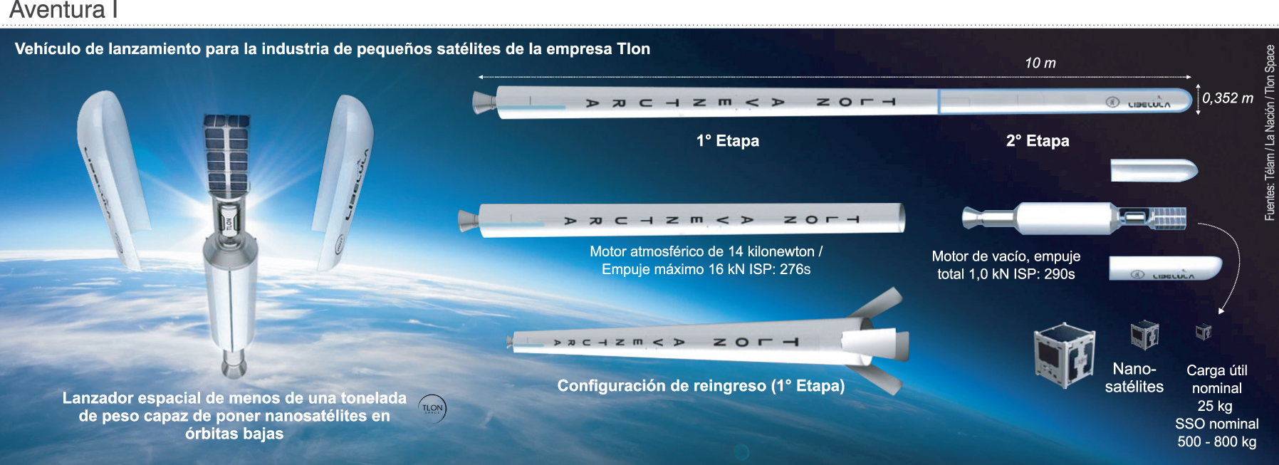 Un economista y un ingeniero argentinos comenzaron en 2005 Tlon Space, una empresa destinada a desarrollar un lanzador espacial de menos de una tonelada de peso capaz de poner en órbitas bajas cargas de hasta 25 kilos, cuyo vehículo experimental tiene previsto cuatro vuelos de prueba a lo largo de 2022 desde su puerto espacial en la costa bonaerense.