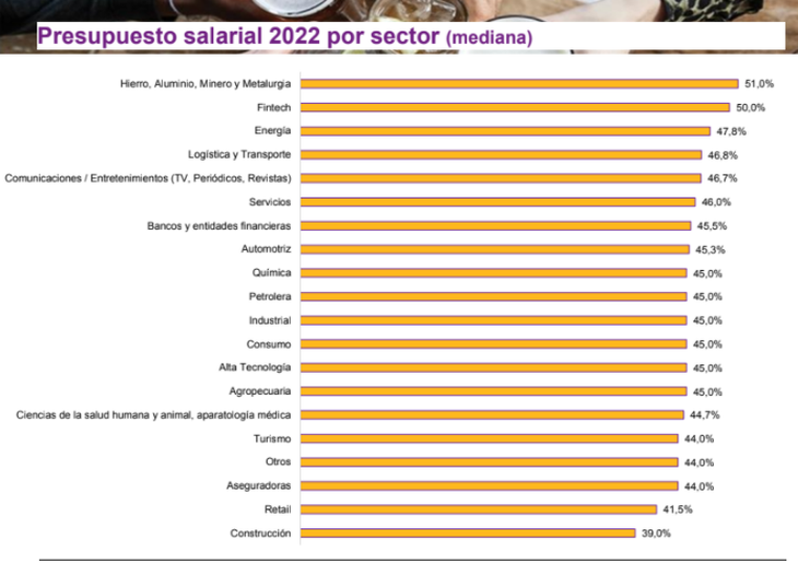 El Relevamiento de Expectativas de Mercado (REM) publicado recientemente estima una inflación que podría alcanzar el 53% este año. Pero las empresas ya elaboraron su presupuesto 2022 y estimaron incrementos salariales del 39% hasta el 51% con una inflación base del 45,9%. Una vez más, el sector de hierro, aluminio, minería y metalúrgica además de las Fintech y Energía, son los tres sectores que contemplan incrementos cercanos a la estimación de los analistas. Por debajo del promedio del mercado, quedaron el rubro de la construcción (39%), retail (41,5%) y las aseguradoras (44%).