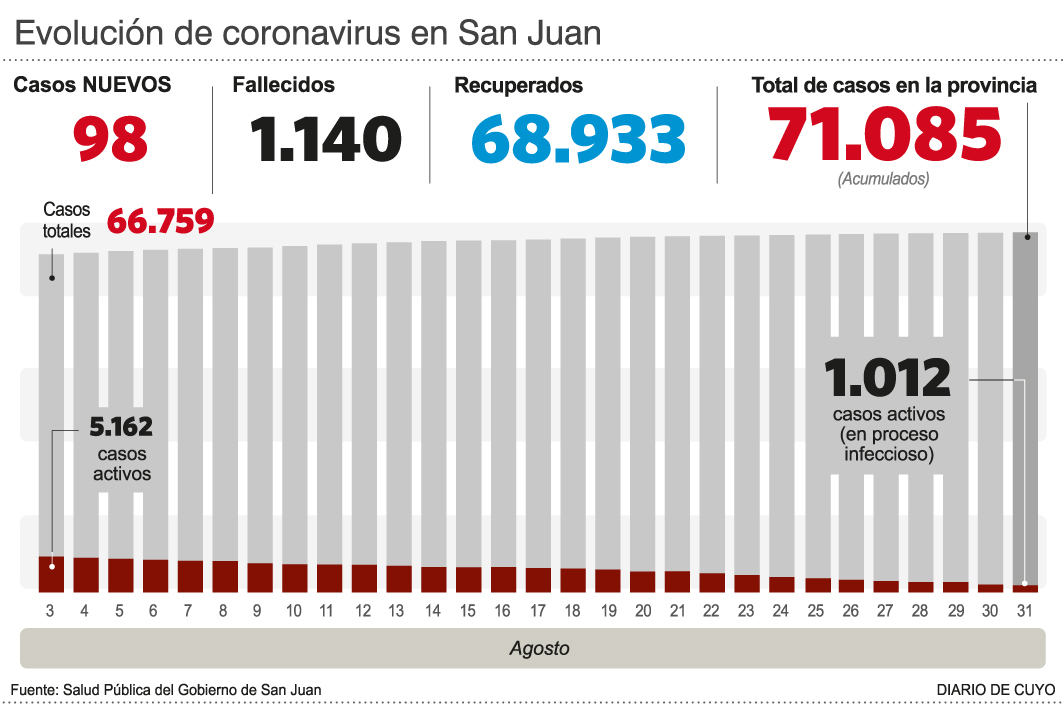 De acuerdo a las estadísticas de Salud Pública, la provincia ayer sumó 98 casos y entonces agosto totalizó 5.102 positivos, lo que implica una notable disminución con respecto a julio, que había cerrado con 11.219 confirmaciones.
