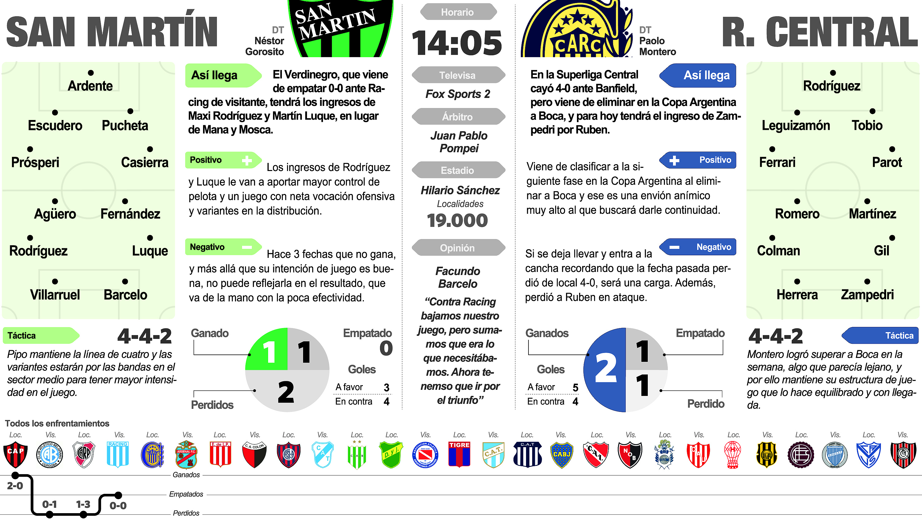 La sobremesa o la clásica siesta sanjuanina quedarán de lado hoy, porque a las 14.05, San Martín será anfitrión de Rosario Central (televisado por Fox Sports 2) en la continuidad de la 5ta fecha de la Superliga. Torneo en el que el Verdinegro sólo ostenta una victoria en el debut ante Patronato, y luego, más allá de tener un buen andamiaje, llegaron dos derrotas y un empate. Por ello es que hoy habrá mucho en juego, con casi como una obligación volver al triunfo, ya que de lo contrario el promedio del descenso empezará a condicionar al equipo de Pipo.