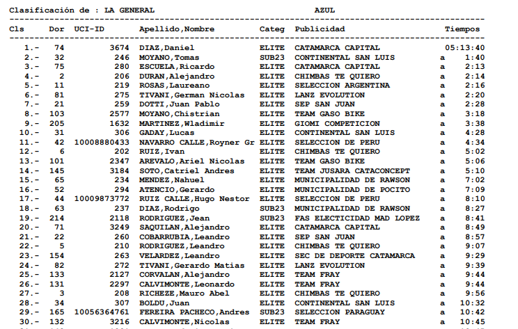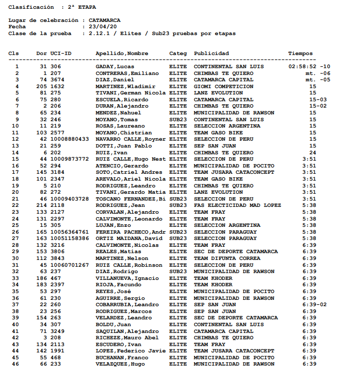 En tanto, en la carrera hubo dos metas de montala y una sprint, que arrojaron los siguientes puestos: Meta de Montaña, 1- Ricardo Escuela, 2- Laureano Rosas y 3- Ariel Arévalo. Meta Sprint, 1- Daniel Lucero, 2- Leandro Cobarrubia y 3- Arian Etcheverry. Meta de Montaña de 2° categoría, 1- Nicolás Tivani, 2- Daniel Diaz y 3- Laureano Rosas.