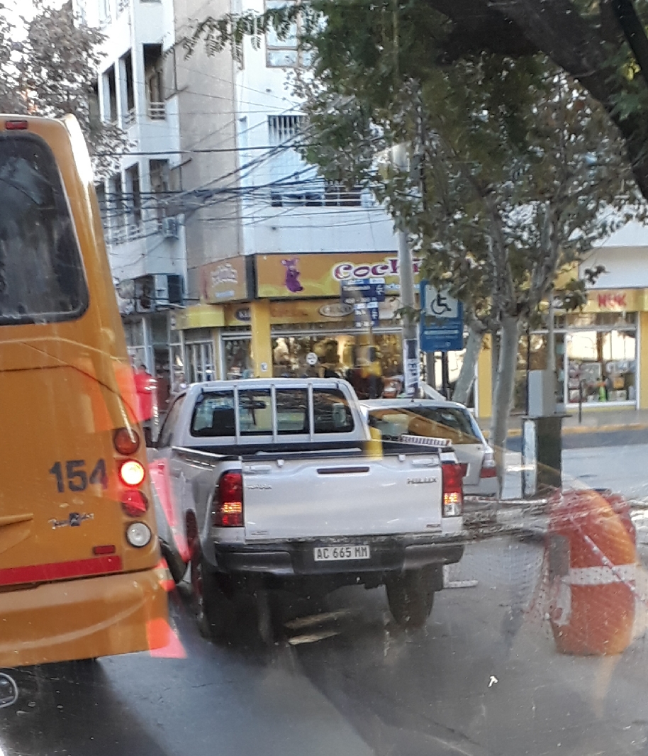Un lector envió una imagen y el siguiente comentario: "En un horario pico esta camioneta en doble fila en pleno centro. No respetan y los monitores haciendo nada, como siempre".