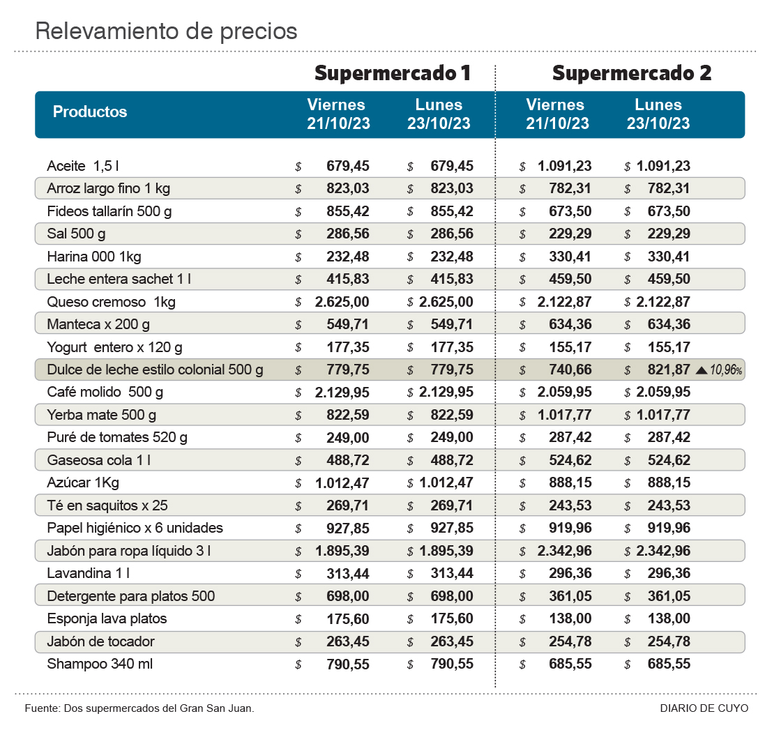 En cuanto al sondeo en supermercados, se efectuó sobre productos de primeras marcas comestibles como harina, azúcar, fideos, aseo personal y limpieza básica para el hogar. Si bien en ambos establecimientos hay una notable diferencia de precios entre mismos productos, sólo el dulce de leche, en uno de ellos, marcaba un precio más alto en comparación con el viernes (Ver infografía).