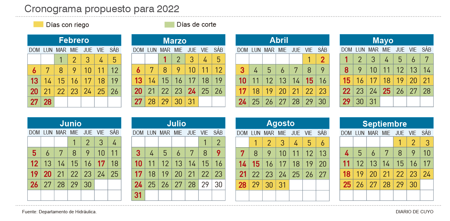 Por eso es que el funcionario insistió con mantener el cronograma de cortes, al que los representantes de las juntas de riesgo se resisten por temor a perder sus cultivos. Dos de los que ya dieron a conocer su voz de alerta fueron Andrés Roca, de la junta de riego de Caucete, y Eduardo Garcés, representante de Chimbas. "Es un desastre lo que se propone", advirtió el primero. El otro representante sostuvo que "no sé en qué va a terminar todo esto".