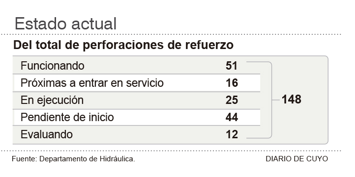 25 Son las perforaciones en las que actualmente se trabaja para ponerlas en marcha y reforzar el agua que se aporta al riego a través de la red de canales de la provincia.