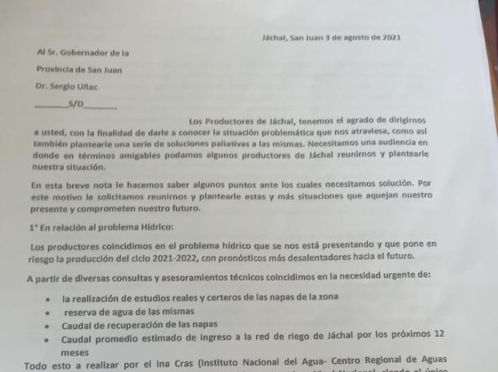 Luego de 2 reuniones con el intendente departamental Miguel Vega, y notas presentadas al gobernador Sergio Uñac, y al Departamento de Hidráulica, los productores rurales del departamento Jáchal no han tenido respuestas ante la problemática actual y analizan medidas. Son más de 300 las firmas recolectadas, de todas las localidades y el pedido radica en un estudio completo para la realización de varios pozos de bombeo subterráneo y el mantenimiento a la obsoleta red de riego lugareña. No quisieron tomar medidas antes de las elecciones, pero ya la paciencia se les agota, indican que hasta diciembre alcanzará el agua para los campos. Ante el faltante, no se pueden regar campos con membrillos, cebollas y alfalfas, los cultivos principales.