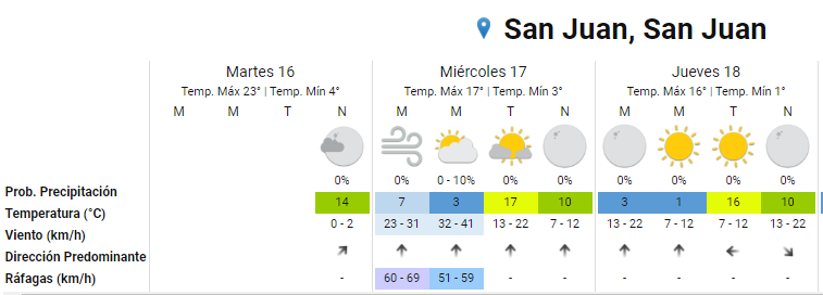 El Servicio Meteorológico Nacional (SMN) publicó que durante la madrugada de este miércoles se presentará viento del sector Sur con ráfagas que pueden superar los 60 kilómetros por hora y además el frente frío provocará el descenso de temperatura, con una mínima pronosticada de 3 grados, y la probabilidad de lluvias aisladas.