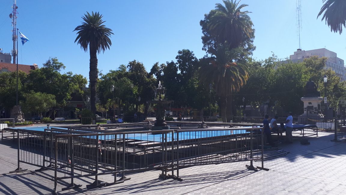 El próximo viernes se realizará por primera vez en la Plaza 25 de Mayo la Noche Soberana, en la que se presentarán en sociedad las 19 candidatas a Reina del Sol. Para eso, en el espacio verde capitalino ya comenzó el armado del escenario.