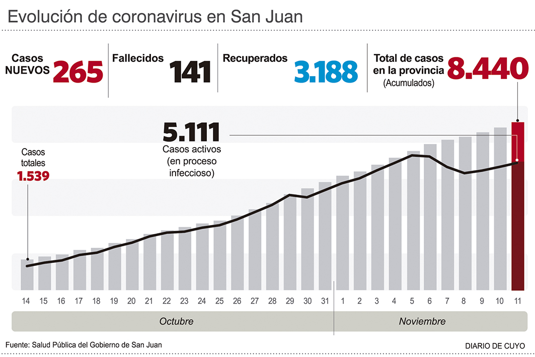 Si octubre fue el peor mes en pandemia en San Juan por cantidad de casos, noviembre lamentablemente lo va a superar. En pleno ascenso hacia el pico en San Juan, en los primeros días de este mes fue registrado el 66% de positivos que en todo octubre. Nominalmente, entre el 1 y el 11 de noviembre fueron reportados 3.010 individuos con coronavirus, en tanto que el total de octubre fue de 4.560. En cuanto a la situación diaria, ayer Salud Pública informó cuatro muertes y 265 nuevos casos, que llevaron el total a 8.440 contagiados.