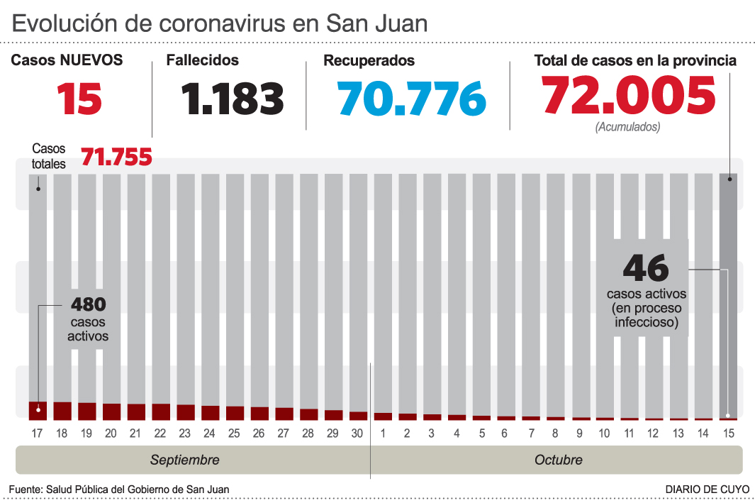Y es que sólo en el primer tramo de aquel agosto hubo menos contagios que ahora, ya que durante ese periodo fueron reportados dos positivos de covid. Luego llegó el 19 de agosto y sólo entre esa jornada y lo que quedó del mes hubo 260 infectados. La pandemia había llegado a San Juan y después, entre algunas altas y bajas en la curva epidemiológica ya no hubo cifras similares a las que está manifestando este octubre de 2021.