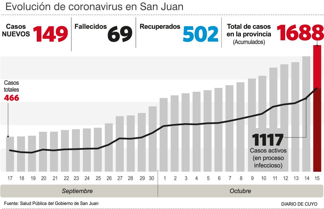 Cuando comenzó este mes, en San Juan los casos positivos eran 982 y los recuperados, 330 (al 1 de octubre). Para el día 5, la provincia ya había roto la barrera del millar de contagios (1.086) y las altas Covid habían ascendido a 391.