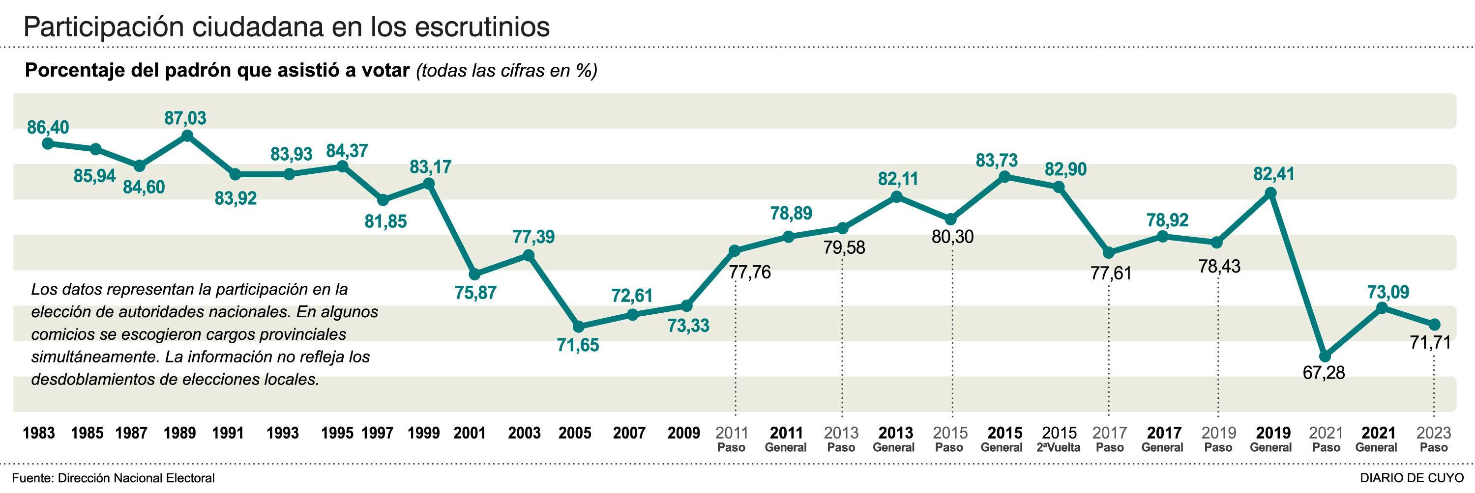 Las PASO de agosto terminaron con uno de los niveles más bajos de asistencia desde el retorno de la democracia, con el 71,71 por ciento de participación, pero, si lo que ocurrió en las últimas seis elecciones se repite, ese valor crecerá. Desde 2011, cuando se estrenaron las primarias, siempre se incrementó el porcentaje de votantes entre esa instancia y las generales, por lo que los frentes políticos anticiparon que lo mismo sucederá por séptima vez. Por eso, la expectativa, de cara a una elección ajustada de tercios, está puesta en qué elegirán en las urnas esos sanjuaninos que no sufragaron en agosto y que se calcula que sí lo harán hoy, los que, si siguen la tendencia histórica, serían unos 13.000. Este grupo se suma a las dudas sobre el comportamiento de otros electores que podrían cambiar su voto, como los que lo hicieron en blanco y los que se inclinaron por frentes que no pasaron a las generales, señalaron desde las alianzas.