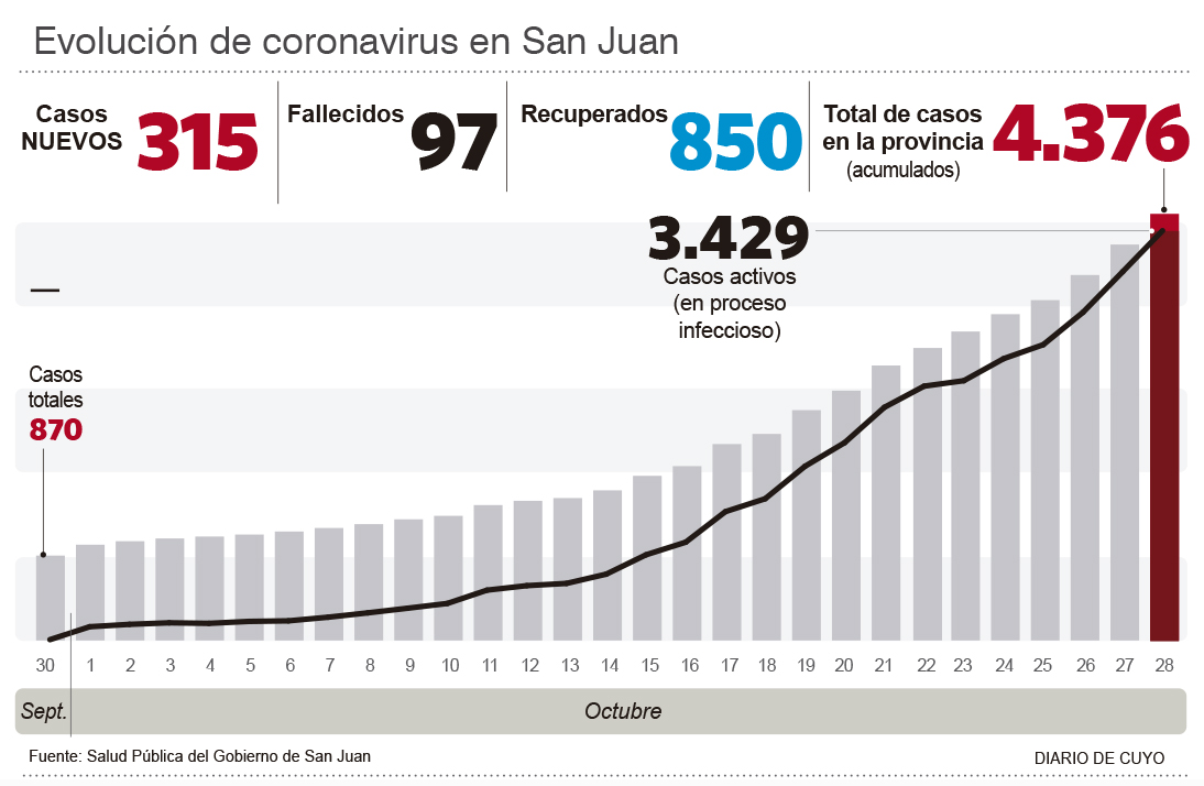 Entre las diferentes herramientas de medición en términos epidemiológicos, una de ellas es el porcentaje de positividad, que surge del total de positivos sobre la cantidad de test realizados. Básicamente, sirve para determinar si se testea lo suficiente como para encontrar positivos y tiene un valor de referencia máximo establecido por la OMS: no mayor al 10%. Por eso, la explosión de casos en la provincia tras la declaración de circulación viral comunitaria tiene una lectura de coyuntura y es que en los últimos 14 días, el porcentaje de positividad en San Juan trepó al 24%, por lo que 1 de cada 4 hisopados realizados en este periodo fue positivo, indicaron fuentes de Salud Pública. Por su parte, ayer fueron informados otros dos decesos y 315 nuevos casos, una nueva cifra récord de confirmaciones diarias (era de 313), para elevar el acumulado a 4.376.