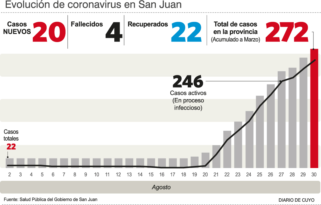 Los casos positivos de coronavirus siguen aumentando día a día. Horas después que desde Salud Pública informaran que creen que el brote comenzó por una fiesta clandestina que se realizó en Caucete, dijeron que en los últimos 12 días en San Juan se detectó en promedio casi un caso por hora. Es que, desde el 19 de agosto, día en el que saltaron los primeros positivos sin nexo en Caucete, la provincia sumó 250 casos a los 22 que ya tenía desde abril. Otro dato que se informó ayer y que también hizo crecer la estadística, de manera negativa, fue la confirmación de una nueva muerte.