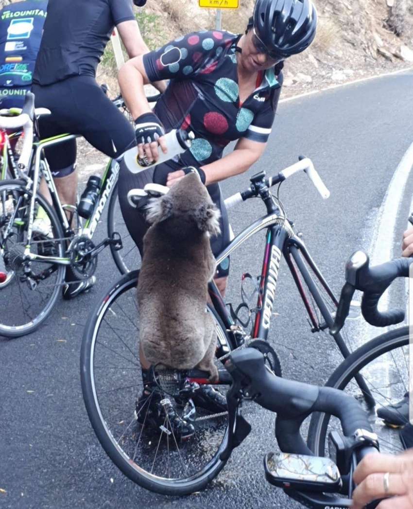 Las imágenes de un koala bebiendo agua de la botella de una ciclista se volvió viral en las redes sociales. El animal desesperado se les acercó a los deportistas que transitaban en la ruta y es uno de los rescatados del impresionante incendio que crece en Australia.