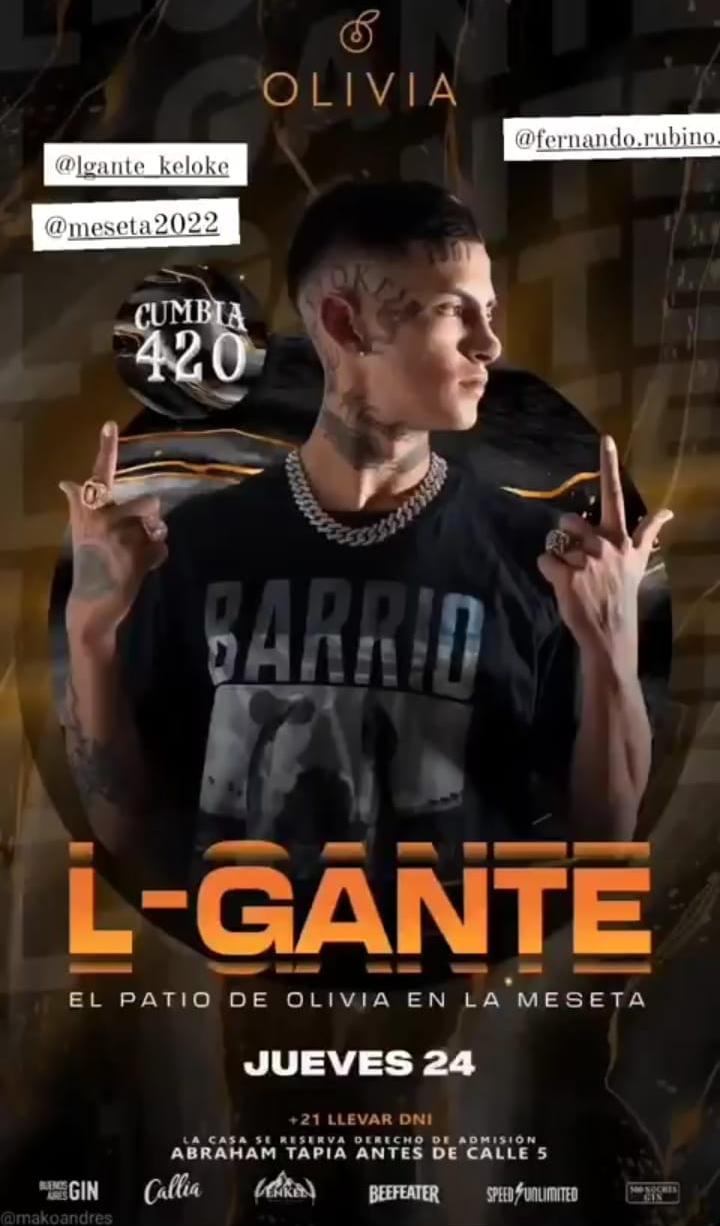 El joven cantante L-Gante fue denunciado el sábado 4 por amenazar de muerte a tres jóvenes y disparar al piso en la localidad bonaerense de General Rodríguez. Según confirmaron fuentes policiales, la denuncia fue realizada por vecinos del músico, quienes contaron a la Policía que en medio de un conflicto, del que no se brindaron mayores detalles, L-Gante sacó un arma de fuego y disparó.