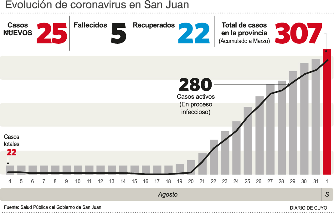Es poco tiempo para tanto dolor: en sólo ocho días, San Juan acumuló su quinta muerte por coronavirus. Según informó el Ministerio de Salud Pública, ayer falleció un hombre de 94 años, quien permanecía internado en el hospital Rawson. Se trata de una persona de Capital y de acuerdo a lo reportado, era contacto estrecho de los casos positivos de Covid-19 registrados en Santa Lucía, que a su vez tienen nexo con el brote generado en Caucete. Por otro lado, la cantidad de personas con coronavirus creció con respecto al parte del lunes pues ayer confirmaron 25 nuevos casos y el total alcanza a 307.