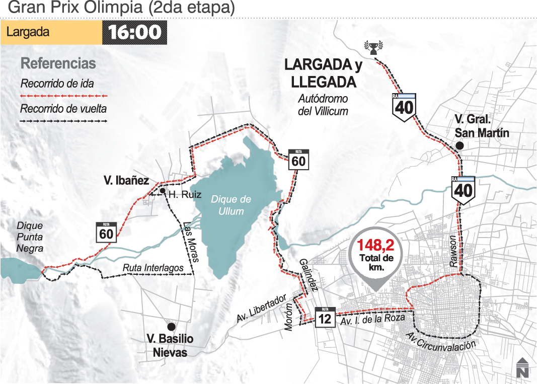 Esta tarde, desde las 16, se disputará la segunda etapa del Gran Prix, el recorrido tocará dos de los parajes turísticos que tiene la provincia, los paredones de los diques de Ullum y Punta Negra. El trayecto, de aproximadamente 150 kilómetros, tendrá dos metas volantes bonificadas, que otorgan 3 y 2 segundos para quienes logren cruzarlas en los dos primeros lugares. Una será en el paredón del dique de Ullum y la otra en la Esquina Colorada. Se eligieron dos puntos tradicionales de la ruta sanjuanina, lugares donde se concentra mucho público.