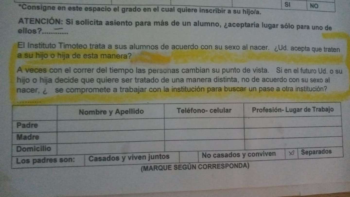 “El Instituto Timoteo trata a sus alumnos de acuerdo con su sexo al nacer. ¿Usted acepta que traten a su hijo o hija de esta manera?”, empezaba el texto. “Si en el futuro usted o su hijo o hija decide que quiere ser tratado de una manera distinta, no de acuerdo con su sexo al nacer, ¿se compromete a trabajar con la institución para buscar un pase?”, planteaba la solicitud de consideración de nuevos estudiantes para 2022 del colegio cristiano evangélico ubicado en el barrio 2 de Abril, en Cerrillos.
