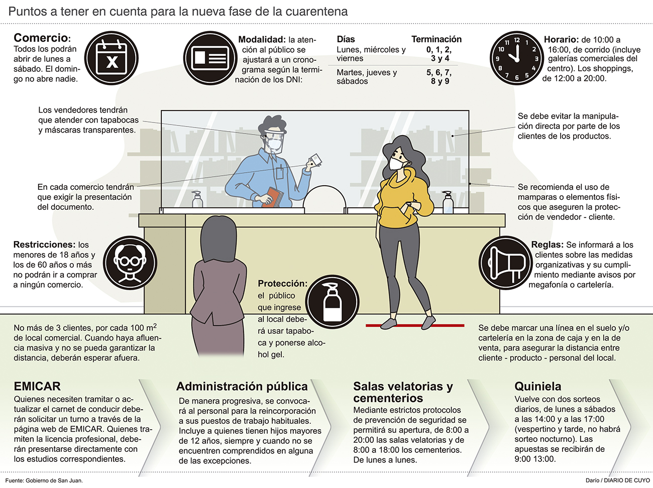 Las personas cuyos DNI tengan terminación de 0, 1, 2, 3, y 4 podrán realizar compras los días lunes, miércoles y viernes, y los que tengan terminación 5, 6, 7, 8 y 9 podrán hacerlo los días martes, jueves y sábados. Los comercios a cielo abierto abrirán sólo 6 horas, de 10 a 16, mientras que los shoppings solo atenderán 8 horas, entre las 12 y 20, ambos de lunes a sábado. "Los domingos todos los comercios deberán permanecer cerrados", dijo Uñac, y alertó que los comerciantes serán sancionados si atienden a personas no habilitadas para asistir, o si no cumplen con las medidas establecidas en los protocolos de prevención. El secretario de Seguridad, Carlos Munisaga, explicó que por incumplimiento a normativas de emergencia sanitaria, de acuerdo al articulo 162 del Código de Faltas pueden establecerse clausuras y multas de hasta $150 mil. Sólo podrán ir a comprar a estos lugares personas de entre 18 años y 60 años, sin excepción.