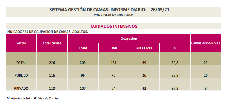 San Juan marcó nuevamente un incremento en la ocupación de camas de terapia intensiva tanto en el sector privado como en el público. Desde el Ministerio de Salud Pública informaron que un 89,8% está ocupado entre pacientes con covid y otras patologías.