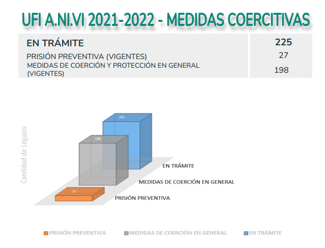 En otro apartado, mencionaron las medidas coercitivas que se dieron durante los procesos, hay 225 en trámite, 27 con prisión preventiva (vigente) y 198 con medidas de protección en general (vigentes). Además, explicaron que en la categoría Trámite, "están incluidos aquellos cuyos imputados han sido declarados rebeldes, causas con acusaciones presentadas, otras con fecha fijada para juicios abreviados y comunes como así también con fecha para que se declare el sobreseimiento".