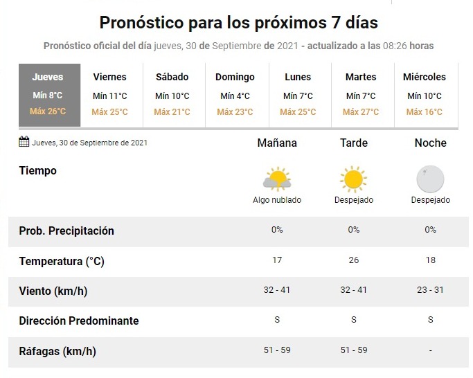 El pronóstico del SMN continúa indicando, pese a las condiciones actuales, que el viento que azota la provincia es del cuadrante Sur por lo cual es difícil saber cuando llegará el frío. Sin embargo, sí indica que las ráfagas podrían aumentar su intensidad en la tarde.