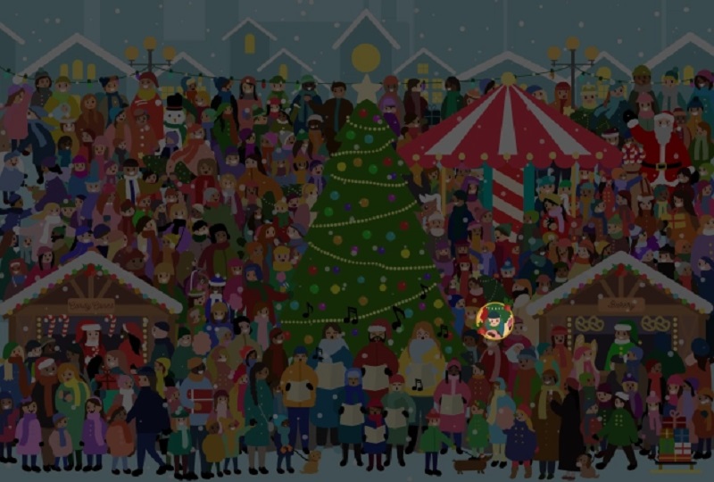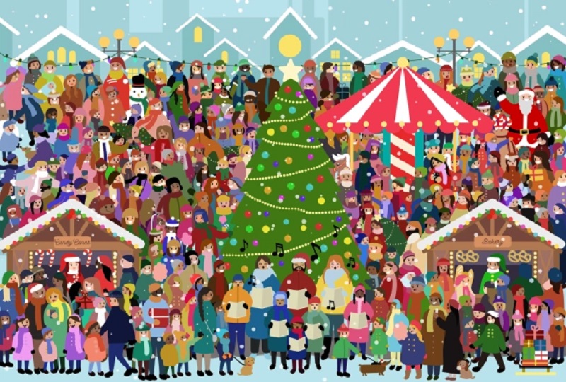 El dibujo es el Rimmers Music que está en el Reino Unido. Es uno de los lugares donde todos los habitantes de la ciudad compran regalos de navidad, toman vino y comen chocolates. Además, hay villancicos y bailes navideños. Entre la multitud de lugareños es difícil distinguir al niño que no está sintiendo el espíritu navideño este año.