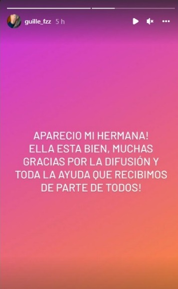 "Apareció mi hermana, ella está bien. Gracias por la difusión y toda la ayuda que recibimos por parte de todos", escribió el hermano de la chica en sus redes sociales durante la madrugada.
