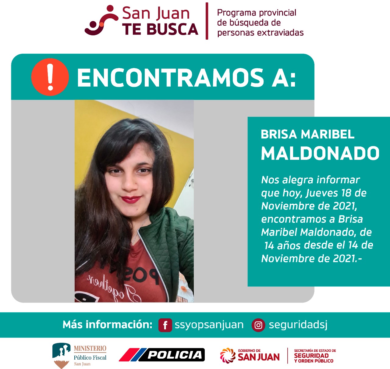 A través del Programa Provincial de Búsqueda de Personas Extraviadas informaron que encontraron sana y salva a la adolescente Brisa Maribel Maldonado.