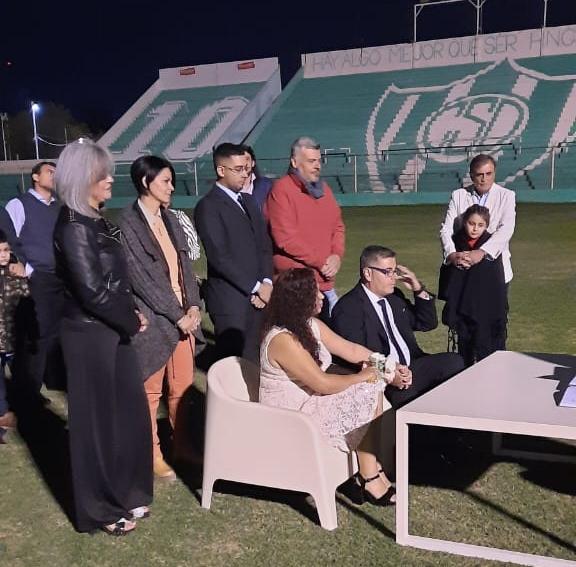 Sueño cumplido para él. Y la mayor muestra de amor de ella. Una pareja sanjuanina decidió contraer matrimonio en la cancha de Sportivo Desamparados. Sí, la boda civil, con invitados y todo, se llevó a cabo en el campo de juego del club de Puyuta. La idea fue del novio, Francisco Andrada, un fervoroso hincha puyutano, quien eligió el estadio víbora para unirse para toda la vida con Monserrat Rodríguez, quien aceptó que el escenario sea elegido por quien desde el viernes por la noche se convirtió en su marido.