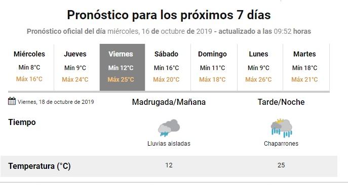Por su parte, el Servicio Meteorológico Nacional ofrece un pronóstico más gris. Para este jueves anuncia una máxima de 24 grados con el cielo algo nublado; para el viernes, de 25 grados con probables lluvias aisladas durante la mañana y chaparrones para la noche; y para el sábado, 20 grados de máxima con chaparrones durante la mañana y lloviznas por la tarde noche.