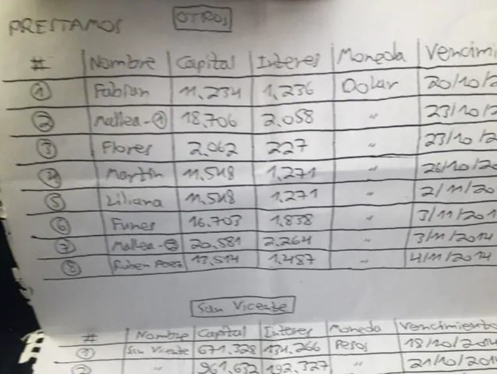 Una de las imágenes que se difundieron en las últimas horas confirma esa última hipótesis. En una libreta, figuran los nombre de pila de personas a las que les había prestado dinero, los intereses, la moneda y el plazo de devolución. En sólo una hoja de ese cuaderno, la cifra superaba los 100.000 dólares. En otra, Gil Pereg anotó préstamos en pesos en la ciudad bonaerense de San Vicente.