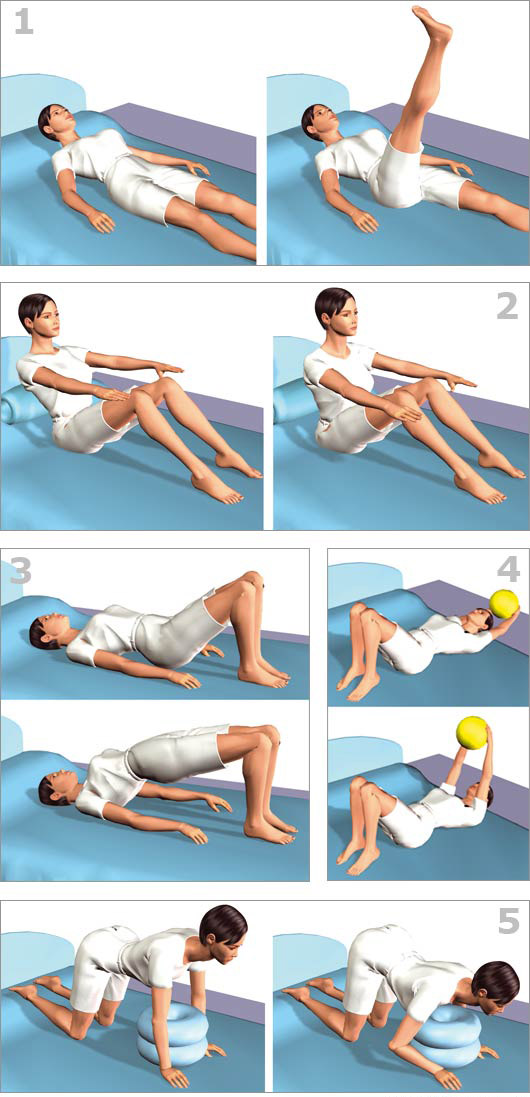 3. Glúteos: Boca arriba con las piernas juntas y flexionadas elevar la pelvis sin despegar la espalda de la cama mientras se inspira el aire por la nariz en forma profunda. Regresar a la posición inicial espirando por la boca. La mejor forma de llevar a cabo el ejercicio es lenta pero controlada para contraer aún más los músculos de la cola (glúteos). Realizar inicialmente una serie de 10 repeticiones y luego de un tiempo incrementar el trabajo hasta completar dos series.