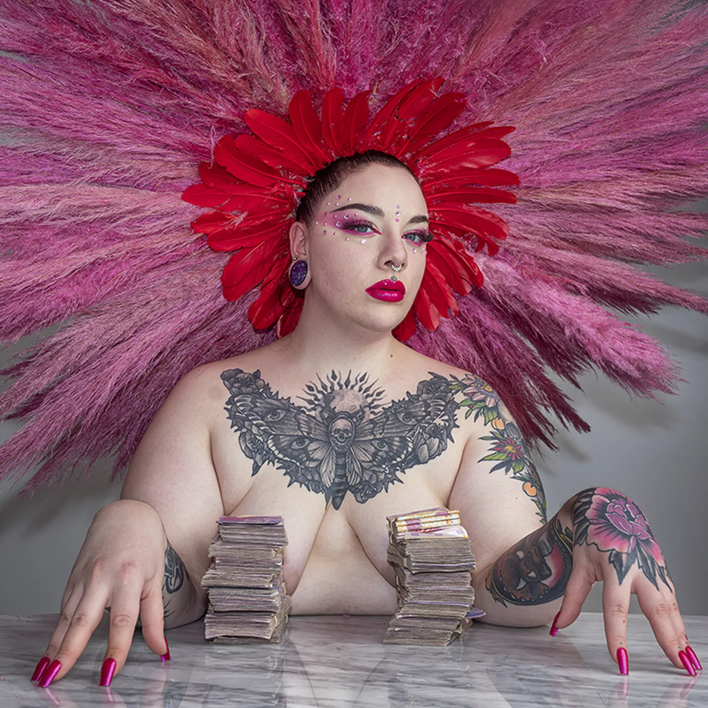 Entre sus fotos, sobresale una en la que se distingue a su marido empapelando una pared con billetes de $10. La fotógrafa buscó retratar que empapelar la pared con billetes de $10 es más barato que comprar papel tapiz.