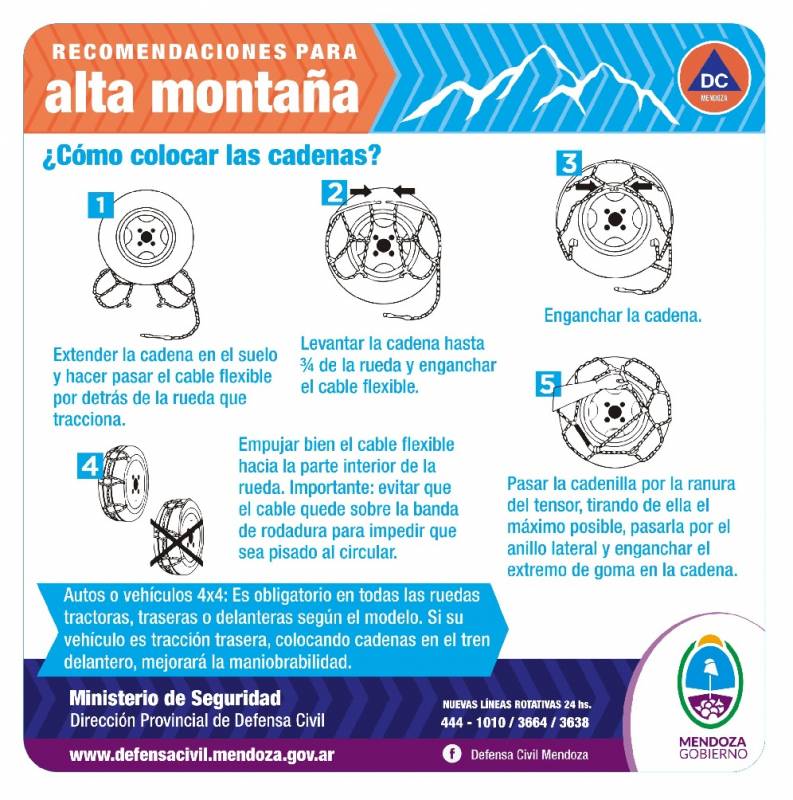 Desde el Ministerio de Seguridad de Mendoza informaron que los vehículos que crucen a Chile a través de la vecina provincia deberán llevar cadenas para el vehículo de forma obligatoria, debido a las tormentas de nieve que afectan la zona de alta montaña en esta época del año.