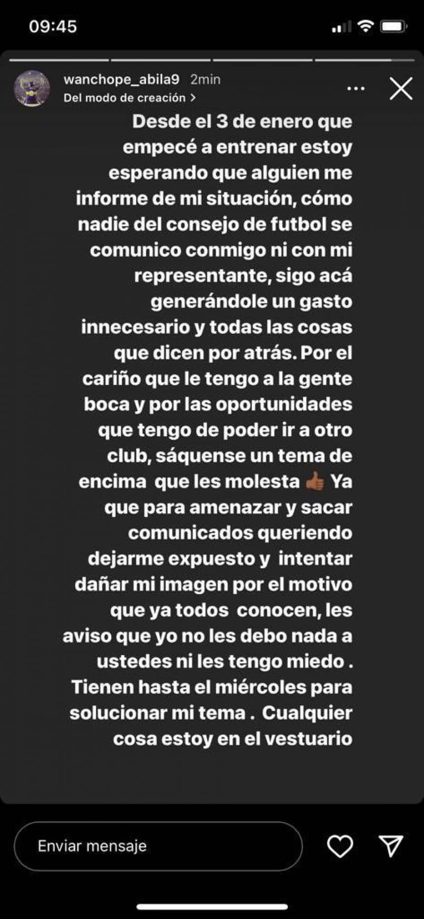 La situación de Ramón Ábila en Boca no tiene marcha atrás: hoy, minutos después de que el club comunicara sobre una nueva lesión del delantero, el cordobés lanzó un durísimo mensaje en redes sociales en los que acusó de mentirosos a los miembros del Consejo de Fútbol y en el que dio un plazo máximo para resolver qué pasará con su futuro.