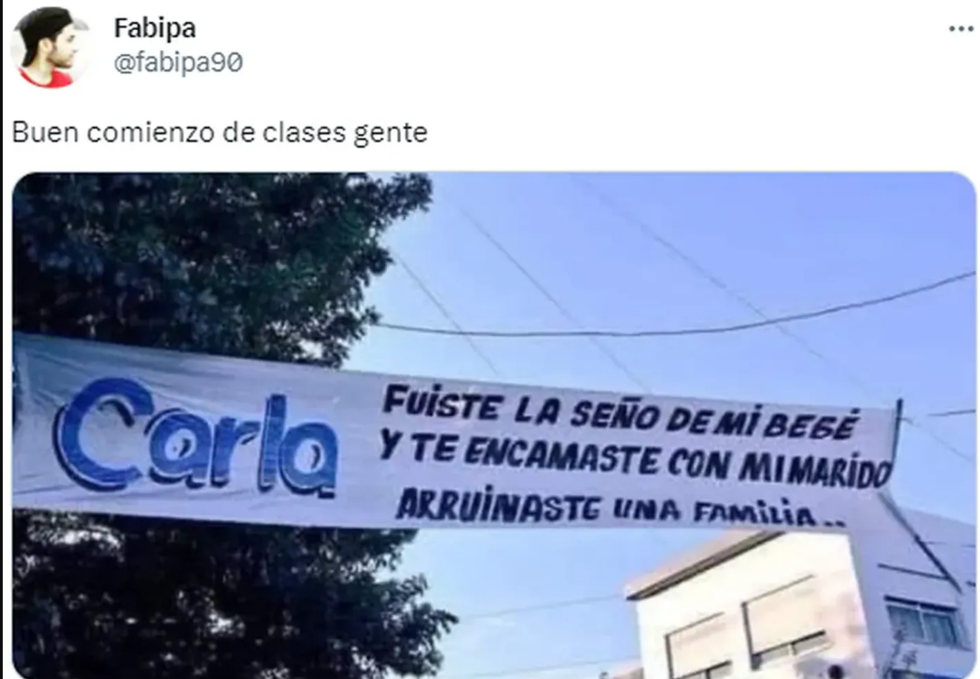 “Buen comienzo de clases gente” escribió junto a la imagen el usuario que hizo viral en Twitter el desopilante cartel que acusaba a Carla de ser una destructora de familias, generando un gran revuelo entre los usuarios de la app.