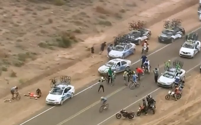 La complicada etapa entre Jáchal y Valle Fértil dejó una impresionante caída que tuvo como saldo a tres ciclistas heridos: los sanjuaninos Ricardo Escuela y Rubén Ramos, y el colombiano Fernando Gaviria.